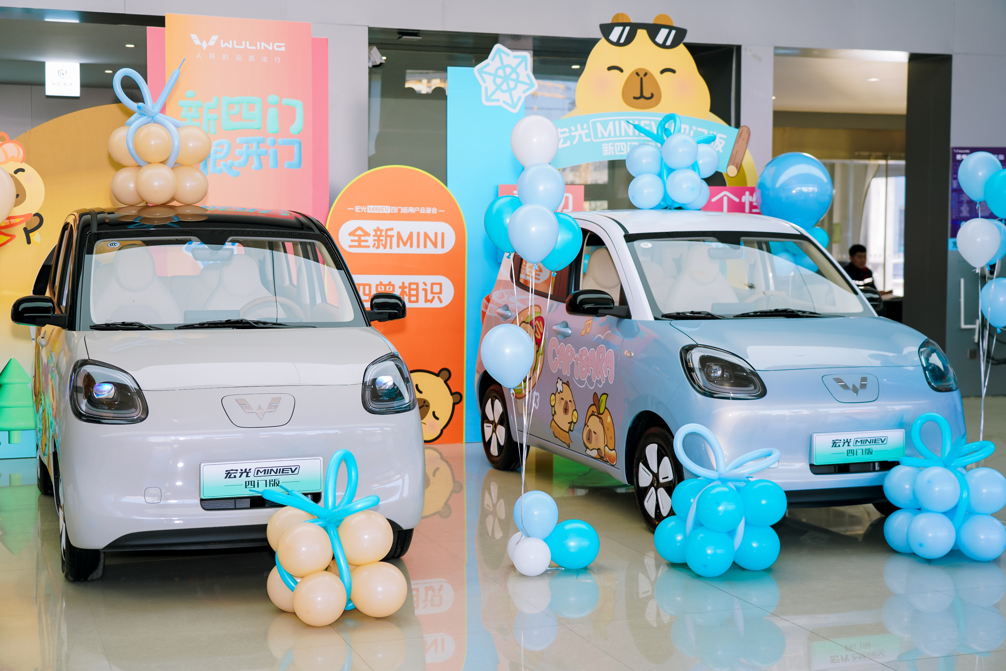 外观上,四门版延续宏光MINIEV经典的可爱圆润风格,前脸封闭式设计搭配圆形复古大灯,呆萌耐看,车身侧面新增后排独立车门,车身长度小幅加长,整体尺寸3260×1596×1616mm,轴距2170mm,相比两门版更修长,车身小巧灵活,窄路会车、侧方停车轻松无压力,特别适合城市拥堵路况。配色依旧丰富,马卡龙色系、纯色系列可选,满足年轻用户、女性用户的审美需求,日常代步颜值在线。